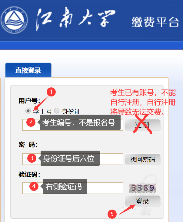 缴费说明:进入复试考生在学院规定的时间内登录“江南大学缴费平台”交纳复试费用,复试收费标准:80元/生。缴费网址://pay.jinmicasino.com/payment/。登录账号为准考证上的考生编号,登录密码为身份证后六位(友情提醒:考生账号已开通,切勿自行注册)。按照提示交费(使用网银),并打印或截图保存付费凭证。