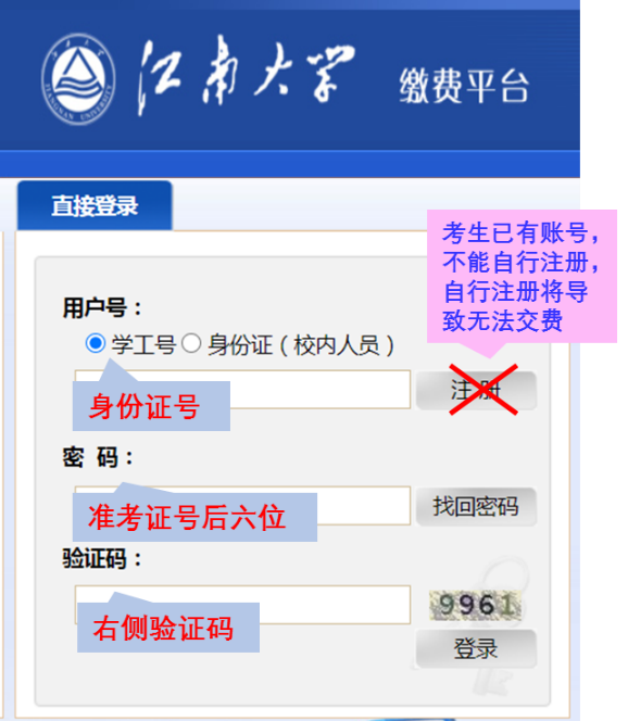 缴费说明:进入复试考生在学院规定的时间内登录“江南大学缴费平台”交纳复试费用,复试收费标准:80元/生。缴费网址://pay.jinmicasino.com/payment/。登录账号为准考证上的考生编号,登录密码为身份证后六位(友情提醒:考生账号已开通,切勿自行注册)。按照提示交费(使用网银),并打印或截图保存付费凭证。