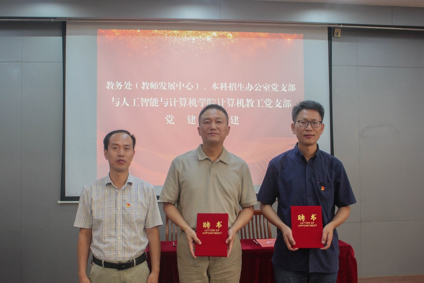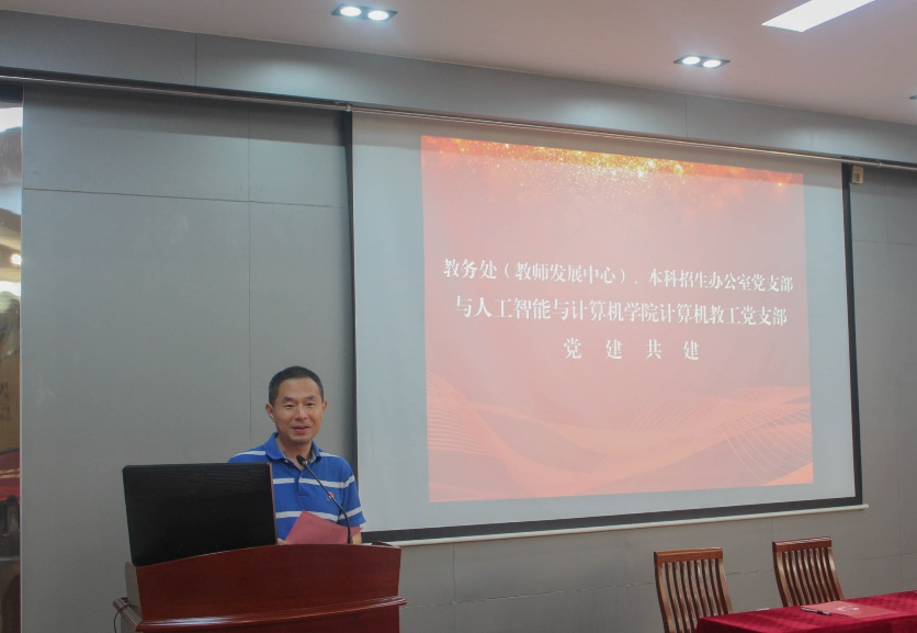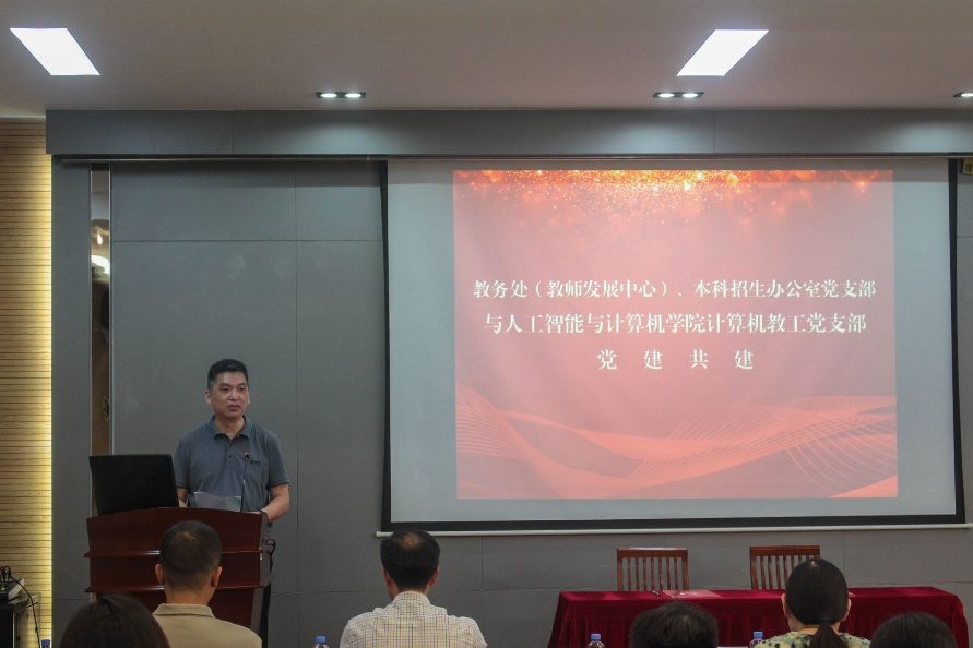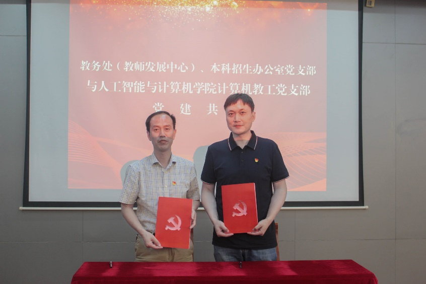 的发展历程和学科发展情况,表达了对本次支部共建的愿景;学院副院长、计算机教工党支部书记宋威和教务处(教师发展中心)、本科招生办公室党支部副书记聂晨曦分别介绍了党建工作、支部发展及教育教学成果等方面的情况;教务处副处长吴宝锁和宋威副院长代表双方党支部进行了支部共建签约。