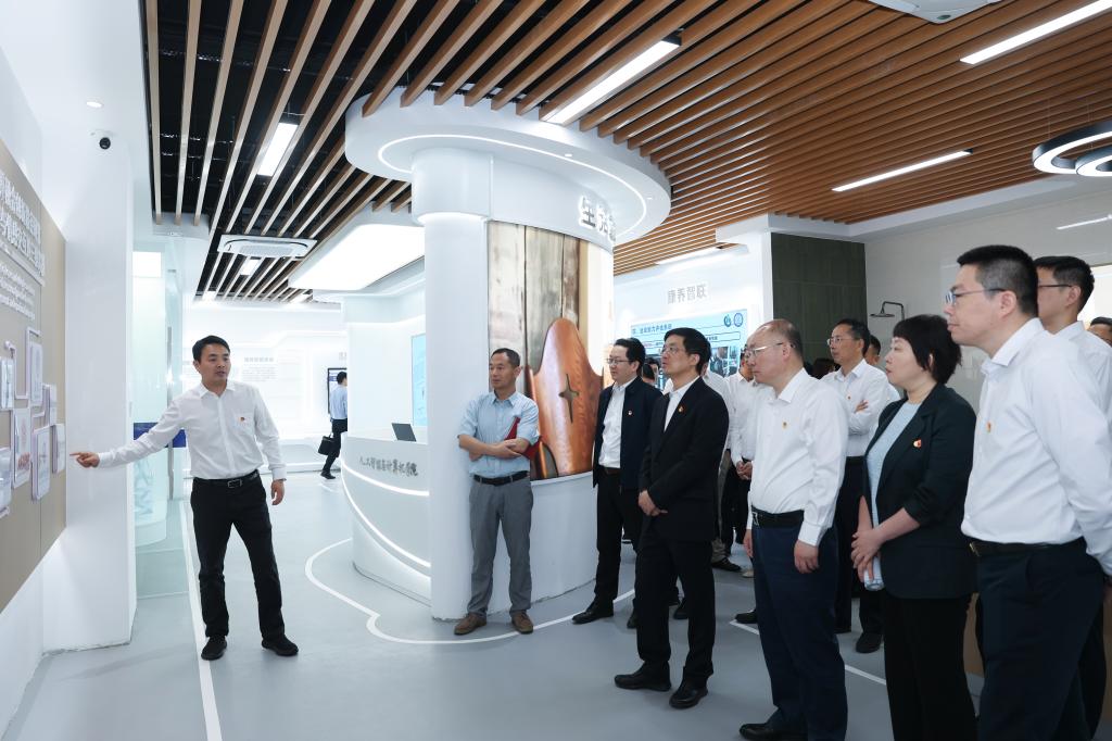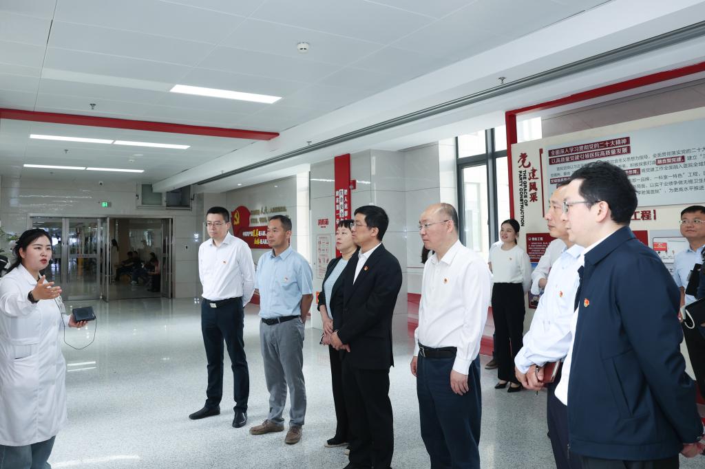 ,参观康养智能化技术教育部工程研究中心,钱鹏江副院长介绍了工程中心的建设运行情况,以及学院在康养智能化领域的前沿技术与研究成果。随后,各单位代表来到江南大学附属医院,通过参观党建长廊感受医院党建文化建设成果。