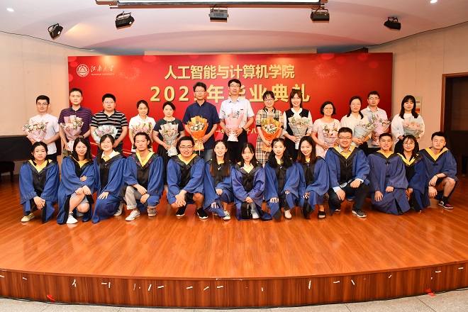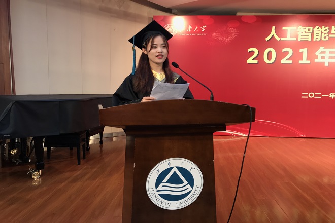 伴随着庄严的国歌,典礼拉开帷幕。院长刘渊首先致辞,他对毕业生提出三点期望:第一要守住初心,保持本真,夯实人生的厚度;第二要学无止境,追逐理想,提升人生的高度;第三要修德励能,勇担使命,拓展人生的宽度。同时,他期待毕业生能够在青春中绽放最美的年华,走向更加辉煌的崭新时代。2017级本科生陈颖作为毕业生代表进行发言。她通过回顾自己在母校的四载时光,表达了母校的眷恋和对老师的感激之情。随后,毕业生代表向教师代表鲜花,感谢老师们在四年时光中所付出的努力与汗水。教师代表邓赵红通过讲述自己在江南大学工作的故事,启迪毕业生在未来的激烈竞争中保持韧性,不忘初心,砥砺前行。学院党委书记张华宣读校友联络员名单并颁发聘书,他希望毕业生无论走到哪里,走得多远,都铭记自己启航出的地方。