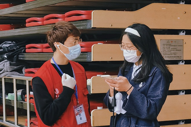 志愿者提醒同学准备灵锡预制码