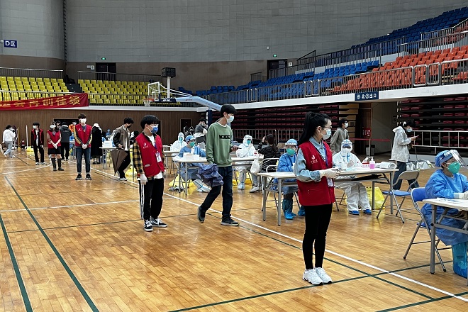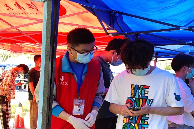 4月11日,我校启动第二轮全员核酸检测,在为期一周的核酸检测志愿者服务过程中,我院党员同学带领学院志愿者们奔忙在核酸检测地点各个地点、快速有序的开展检测工作。身穿“红马甲”的我们有条不紊的协助医护人员进行入口引导、核酸检测预登记、现场秩序维护、出口登记等工作。在服务过程中,志愿者们坚持用心服务,用爱值守,考虑到核酸排队需要一定的时间,我们还贴心准备了充电宝等设备,以防同学手机没电无法显示预制码等特殊情况。志愿者们分工协作,操作娴熟,为核酸检测工作的顺利进行贡献青春力量。