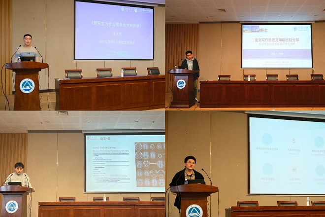 下午,Information Fusion期刊审稿人李辉博士做《论文写作思路及审稿经验》的主旨分享,以审稿人的视角详细介绍了科学研究的研究思路、文献阅读方法、及写作思路,鼓励大家找对方向、做有意义的研究。“互联网+”银奖获得者王良哲、ICCV2021多模态视频推理分析大赛冠军获得者李荣昌分别进行创新创业主旨报告,围绕研究生为什么做科研、怎样做科研、为什么参加学科竞赛、科研和竞赛的关系等问题展开讨论,极大增强了同学们做科研的初心和信心,调动了学生参加学科竞赛的主动性。随后,最佳论文获奖者的朱振豪、吕天旭分别做交流分享,他们介绍了自己在科研时做什么,如何做等问题,并围绕近期的研究内容与在场学生交流沟通,并提出研究生的学术生活应该以“兴趣为源,踏实为基,创新为核”,勉励全体研究生潜心学术、追求创新。