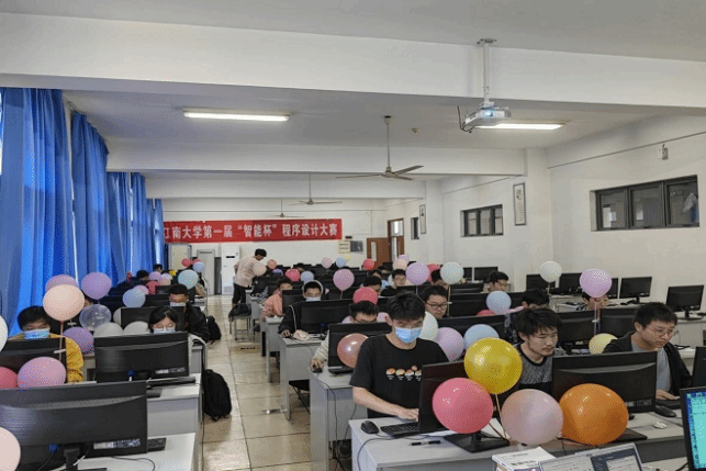 此次大赛于10月11日-14日发布大赛通知且开放报名通道,吸引了全校来自不同学院近300名同学报名参赛。大赛共分三个阶段:网络预选赛、热身赛及现场赛。经过网络预选赛后,有44名同学进入到最终的热身赛及现场赛。现场赛中每个题目对应一种颜色的气球,成功解答该题目的队伍会得到对应颜色气球。比赛现场竞争激烈,同学们争分夺秒,气球争相升起,经过长达5个小时的角逐,江南大学首届”智能杯”程序设计竞赛成功落下了帷幕。