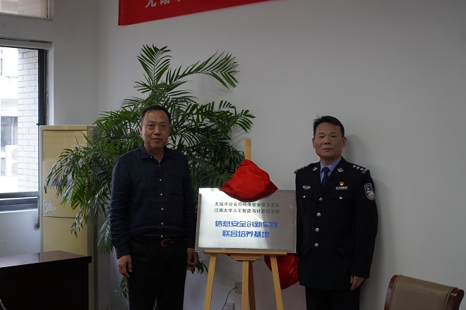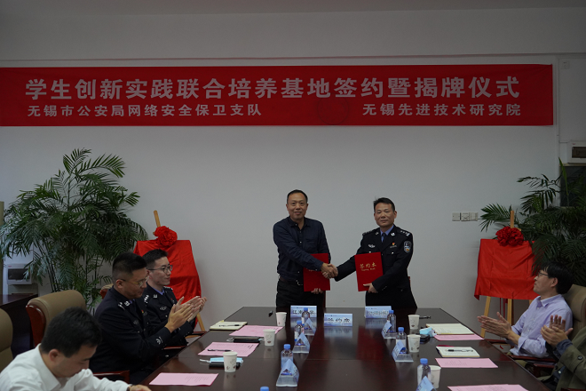 在B318会议室举行学生创新实践联合培养基地签约暨揭牌仪式。无锡市公安局网络安全保卫支队政委沙泳江、二大队大队长俞晓川、六大队副大队长杭飞健,无锡先进技术研究院副院长刘杰、人力资源部主任李璞、生态软件研发部主任王俊等,金米娱乐