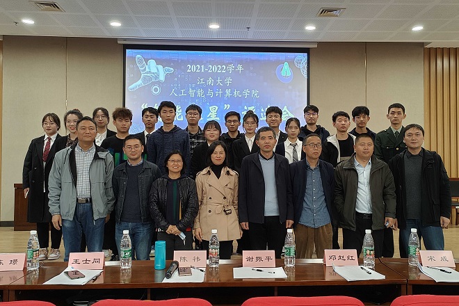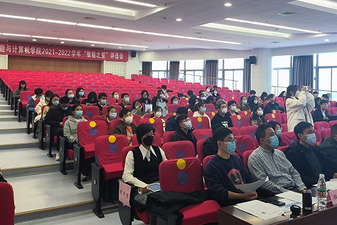 2021-2022学年“智能之星”答辩评选会在图书馆305报告厅举行。学院党委副书记、副院长陈祎,副院长谢振平,数字媒体技术系主任邓赵红,人工智能系主任宋威,教授代表王士同、毛力,班主任代表陈璟,分团委副书记陆恒杨、杜磊,全体辅导员及部分学生代表出席活动。
