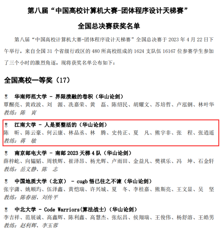 学子获得全国团体一等奖,个人获得全国二等奖1项、三等奖5项,实现学校在团体程序设计天梯赛上最高奖项突破。