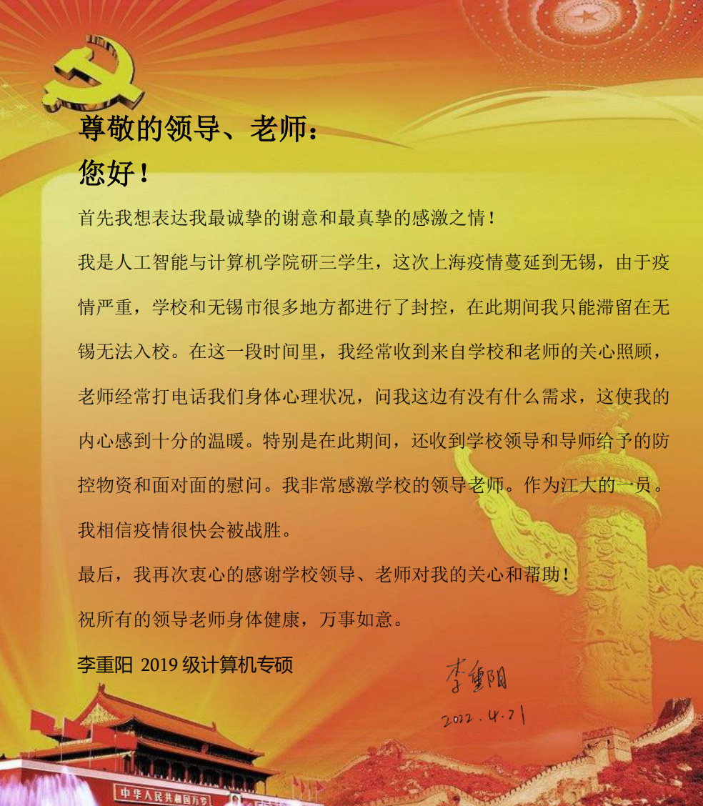 慰问结束后,学生在朋友圈中写道:方老师与杜老师披着星光过来探望我们这些滞留无锡无法返校的学子,让我感到非常温暖与亲切。难以忘记你们专注的眼神,难以忽略你们无私的帮助,难以报答你们对我的教导。现在的我只能对你们说一句,谢谢你,江南大学。