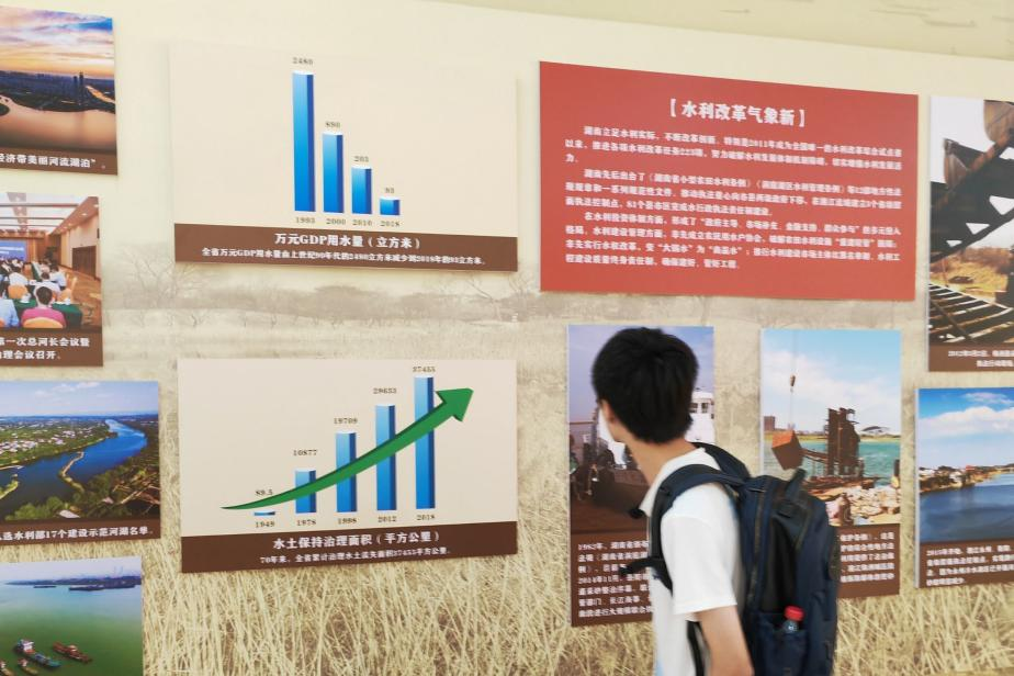 8月7日,实践团来到长沙市水利局调研参观。在参观展示厅时,团队成员认真聆听了工作人员的讲解。近年来,在科技赋能生态环境保护下,洪水的威胁不再让人民群众感到无助,展板上的数据和实物模型生动描绘了长沙多年来在治水方面取得的成绩。