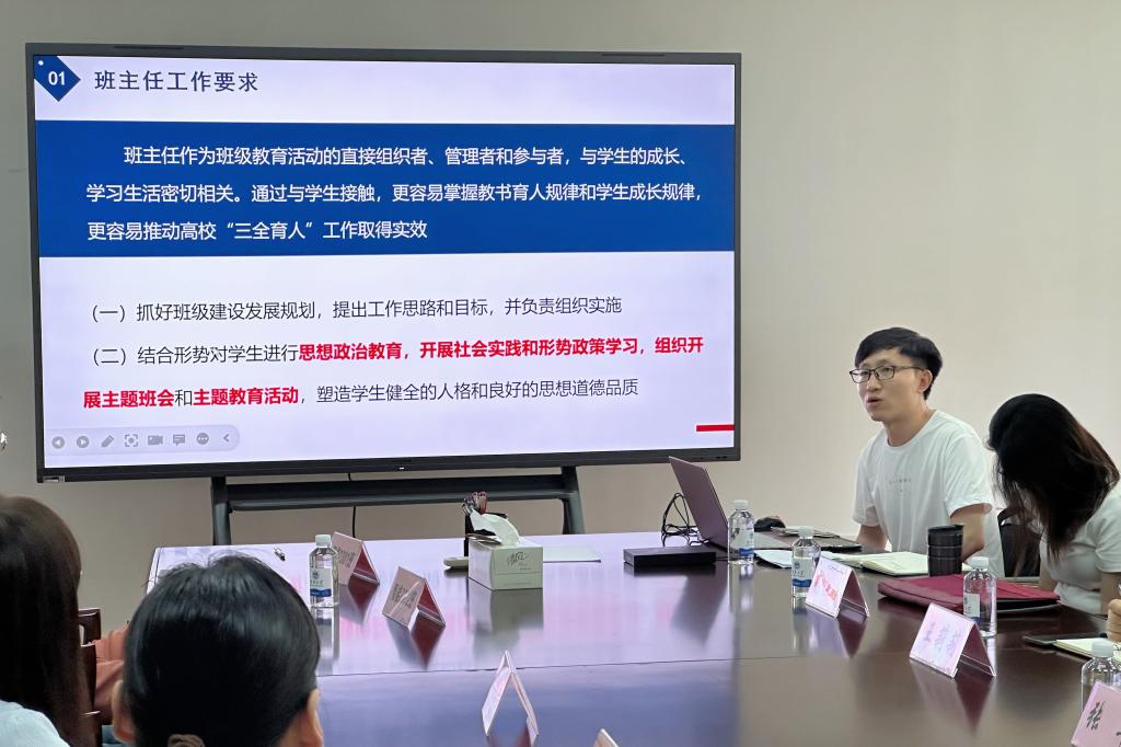 会上,新生辅导员李猛基于“三全育人”理念,从学生思想政治教育、班级建设和日常管理、学风建设等方面介绍班主任工作的具体职责和要求,详细解读江南大学优秀班主任评选办法,并围绕“如何开展好第一次主题班会”“如何做好新生心理普测”“如何营造班级优良学风”等话题与在场师生进行交流。