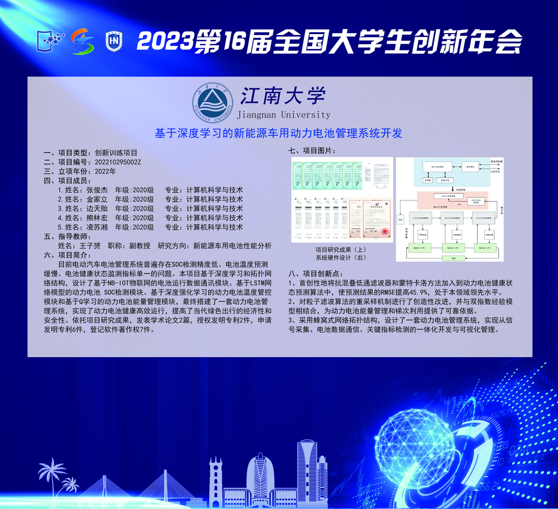 学生苏雅楠创新训练成果《基于卷积神经网络的多模态医学图像配准系统》(指导老师:蒋亦樟)、张俊杰创新训练成果《基于深度学习的新能源车用动力电池管理系统开发》(指导老师:王子赟)两个项目入选改革成果展示,是人工智能学子在创新创业领域取得的又一项重要突破。