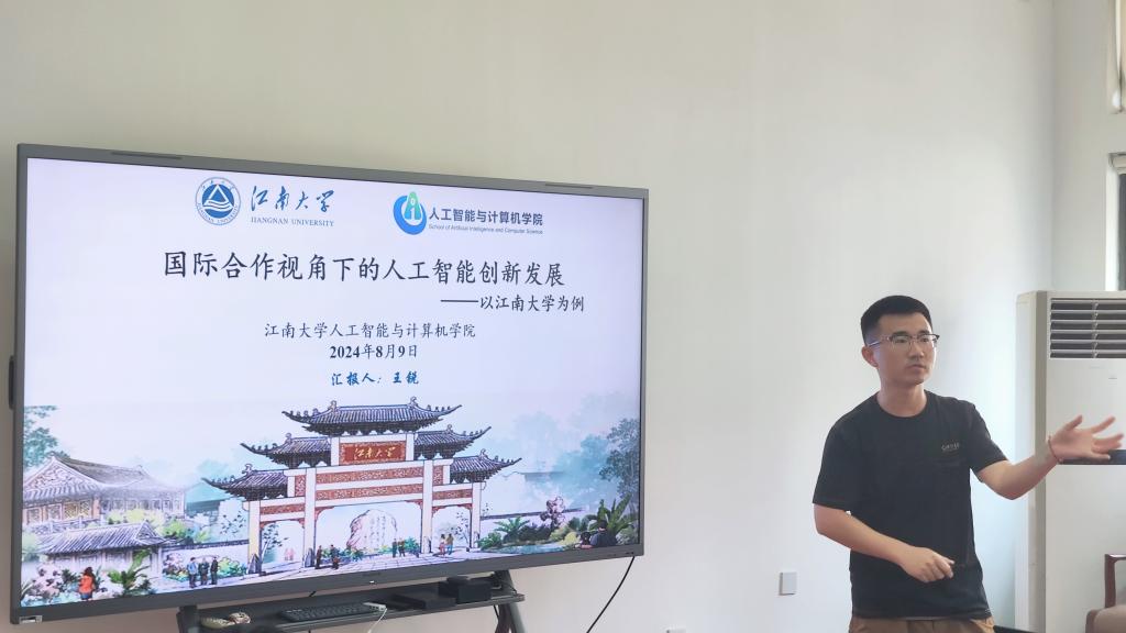 王锐对实践团师生的到来表示欢迎,并作题为《国际合作视角下的人工智能创新发展》的讲座。他以江南大学为例,介绍了金米娱乐