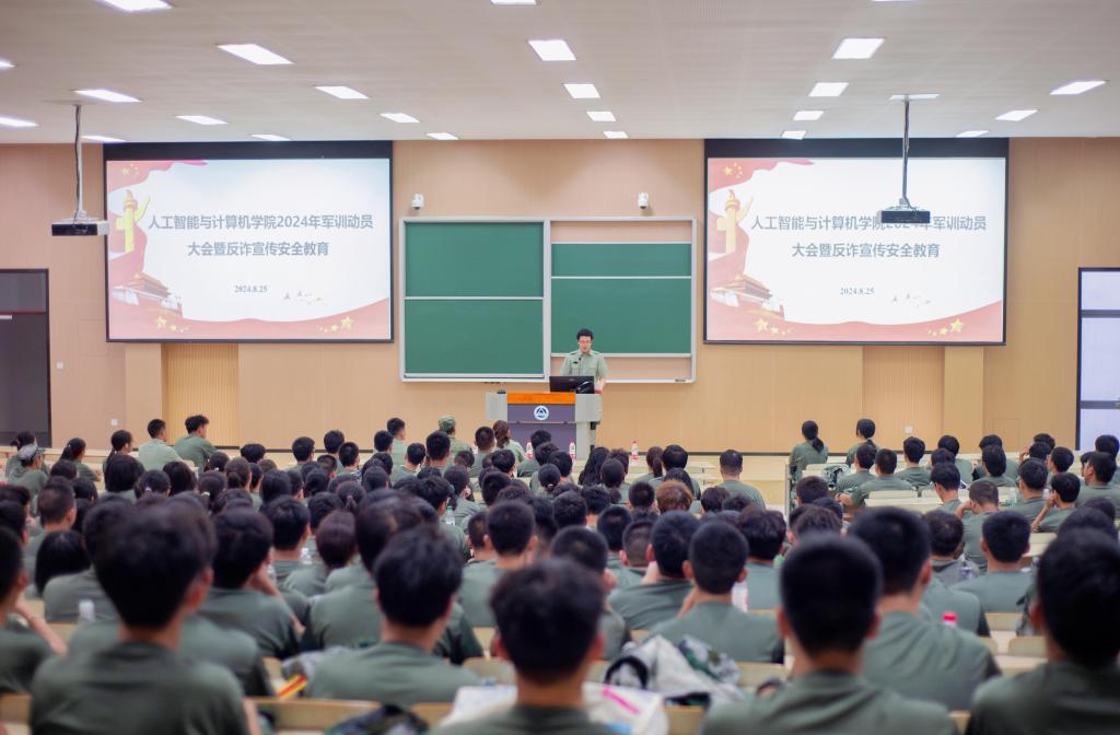 2024年军训动员暨反诈宣传安全教育大会在二教2A127召开。学院党委副书记、副院长王莉莉,江南大学人武部国防教育中心科长刘璇刚,无锡市滨湖公安分局雪浪派出所民警戴科,辅导员戴士焱、丁嘉铖及2024级全体本科生参加会议。会议由丁嘉铖主持。
