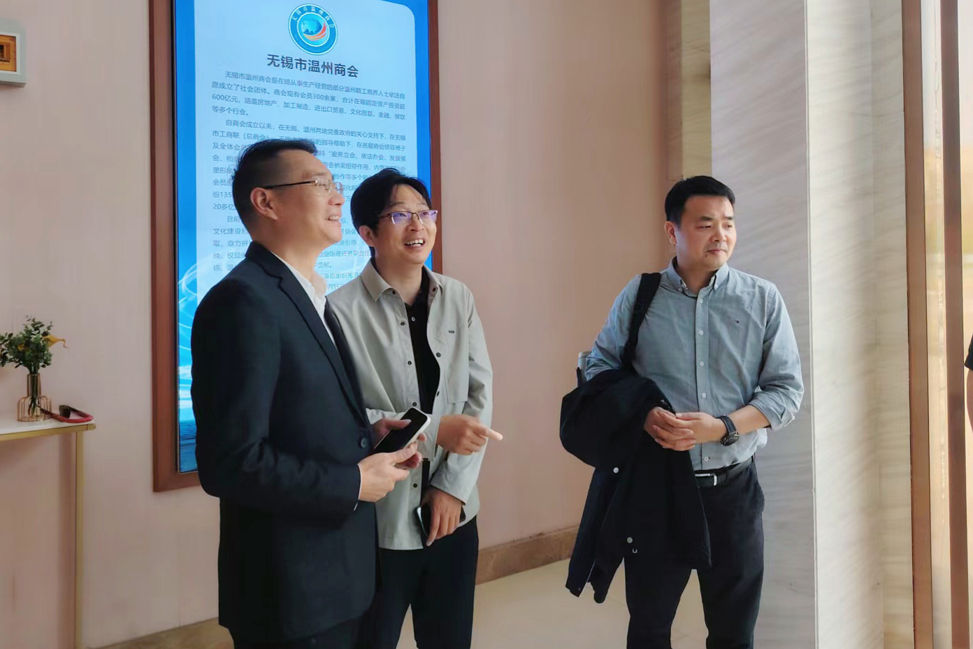 党委书记陈琳、副院长钱鹏江、学工办副主任杜磊,人工智能创新人才培训中心副主任孙博等走访无锡市温州商会。温州商会会长黄会伟,常务副会长马小华、王晓峰、邵海峰等企业家热情接待并参加座谈会。座谈会由商会党支部书记兼秘书长张式义主持。