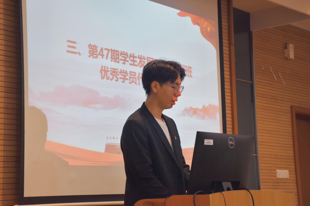 第47期学生党员发展对象培训班优秀学员代表廉晓庆从理论学习、实践活动、践行宗旨三个方面,分享了自己参加培训的经历,他表示作为发展对象要肩负时代重任,全心全意为人民服务,为实现中华民族伟大复兴贡献青春力量。仪式上,第48期学生党员发展对象培训班全体学员进行了庄严的宣誓,表达了青春心向党的铿锵誓言。党建辅导员戴士焱对本次培训的安排和纪律要求进行了介绍。