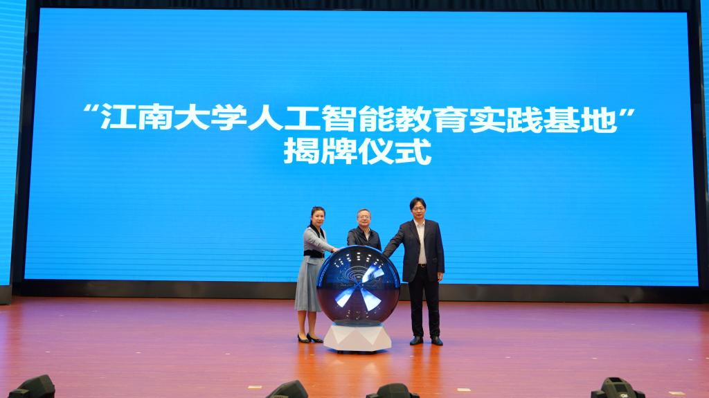 活动现场,陈曦、陈琳、李晓红共同按下启动键,为“江南大学人工智能教育实践基地”揭牌。