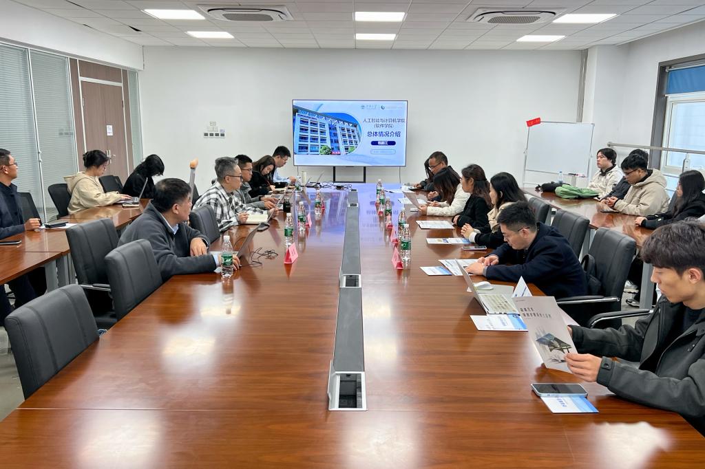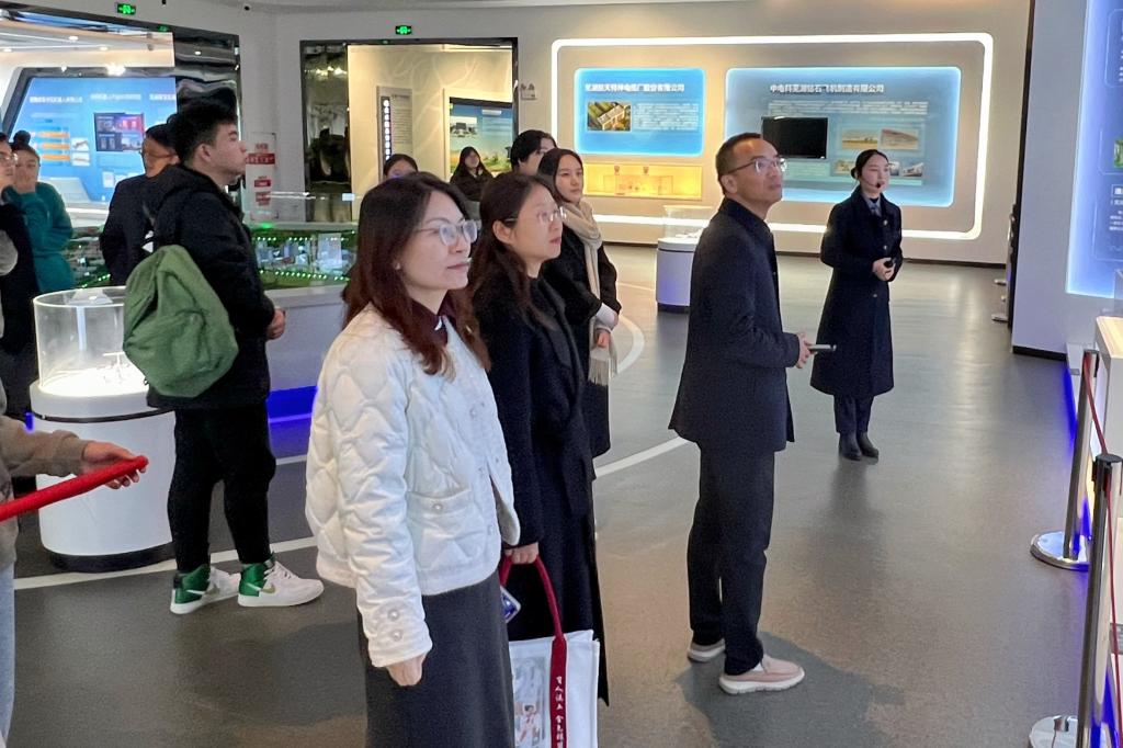 芜湖市鸠江区政府副区长蔡金平、鸠江区人社局局长肖宗明、芜湖市人才服务中心副主任高政铭,芜湖市大学生实习实践基地负责人夏荷和基地各部门负责人热情接待两学院师生,并围绕深化产学研合作进行座谈交流。夏荷详细介绍了基地的发展历程、认知实习服务、“青蓝工程”定向就业班等方面的显著成果和独特优势,期待与我校建立紧密合作,共同探索校地合作的新模式、新路径,为大学生实习就业提供新思路、新平台。