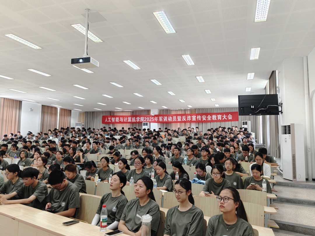 在二教A127召开2025级学生军训动员暨反诈宣传安全教育大会。学院党委副书记、副院长王莉莉,无锡市滨湖公安分局雪浪派出所民警康伟锋、王焱伟,辅导员戴士焱、张诗浛及2025级全体本科生参会。本次会议由戴士焱主持。