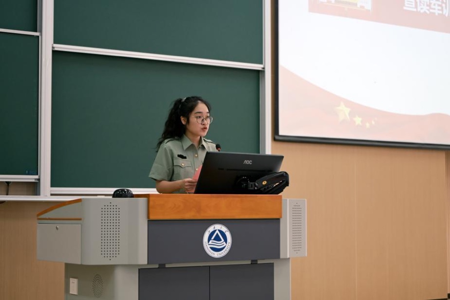 退伍学生代表、计科2201班才闯结合军旅经历,勉励同学们以饱满精神和严格标准迎接训练,做到守纪律、能吃苦、讲团结,在磨砺中收获成长。参训学生代表、计科2501班龙淑婷表示,将端正态度、服从指挥、团结协作,展现新生昂扬风貌。会上,王莉莉为学生代表授旗,全体参训学生庄严宣誓。随后,张诗浛讲解军训管理细则,重申出勤、请假及日常规范等纪律要求,号召同学们以军人标准严格自律,专注训练,令行禁止。